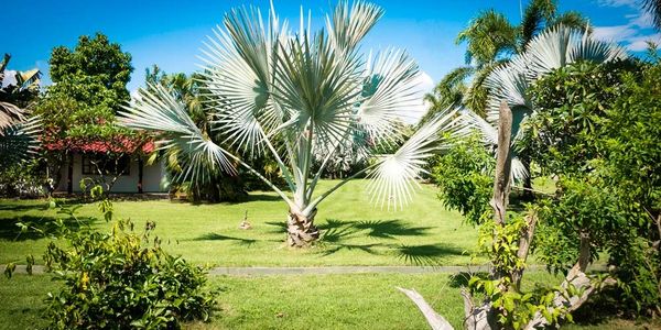 This secluded retreat features ten thousand square meters of lawns, tropical plants and trees, a small lake, a grass thatched Thai-style sauna, an open kitchen, and even a restaurant.